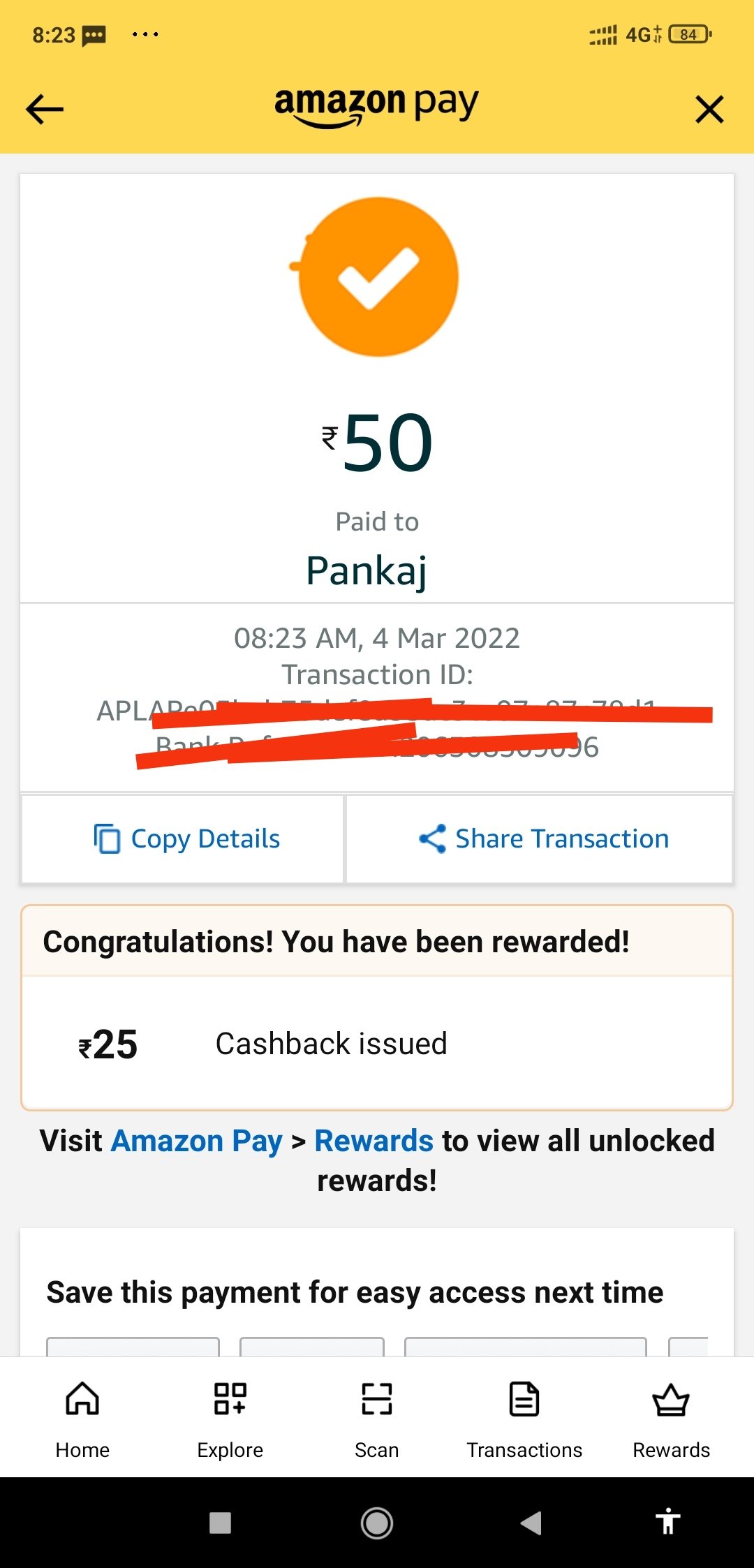 After Payment Done You’ll Get Reward Notification Open Amazon App – Amazon Pay – Click – Reward – Scratch The Scratch Card.