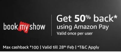 Bookmyshow offer – Get 50% Cashback Book Ticket vs amazonpay balance upto ₹100