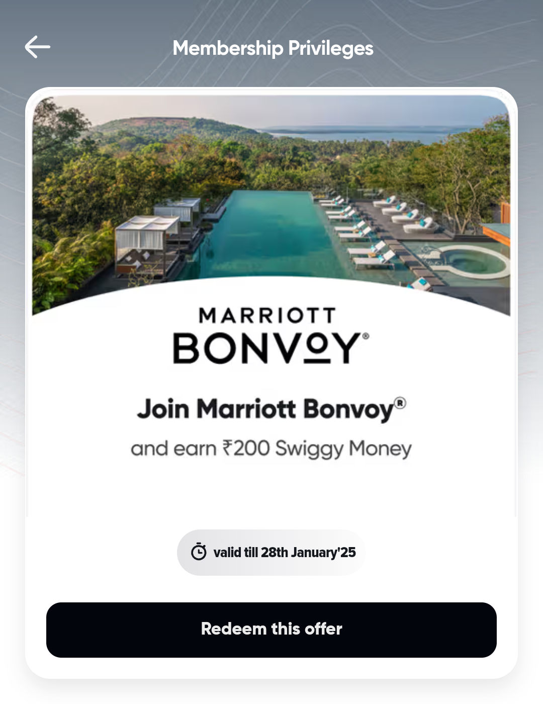 Swiggy has partnered with Marriott Bonvoy, a loyalty program by Marriott International.