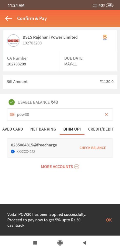 - The offer is valid on a minimum transaction of Rs.400. Offer is valid for Electricity Bill payment only