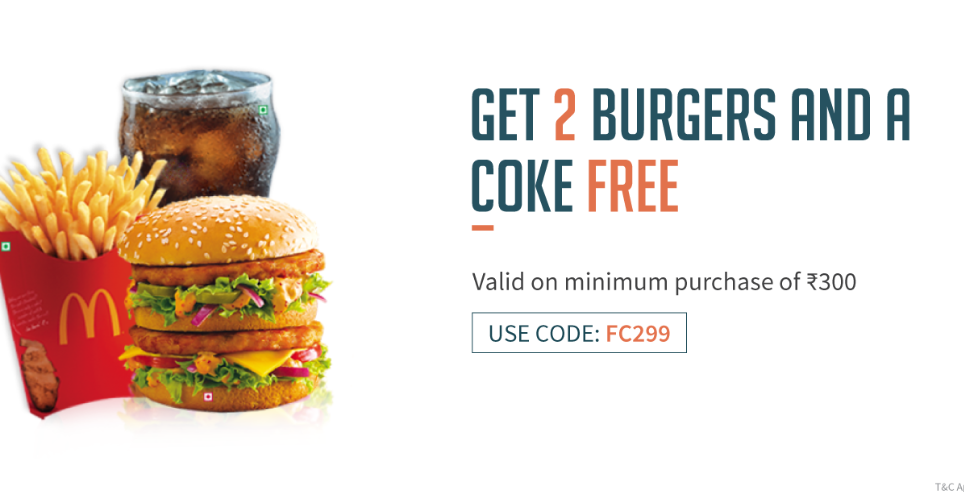 - Use code FC299 and 2 Free McVeggie/McChicken Burgers & a large coke free on orders above Rs. 299