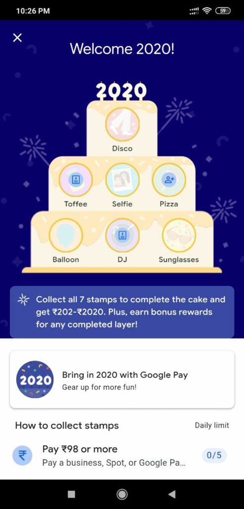• Get a scratch card with an assured gift from Google Pay worth ₹202 to ₹2020 when you complete the cake by collecting all 7 different stamps.