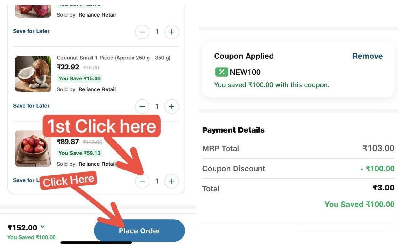 👉 Abhi Jo ₹100 wala Item Add kia Uske Remove (Minus) Button pe aur Place Order pe Ek sath Click krna hai Pehle Minus pe Click Karo fir turant Place Order pe Click krdo Ekdm Fast Fast.