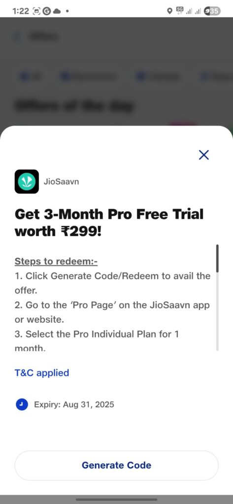 - Go to the Offers Section and select JioSaavn Pro 3 Months Free Subscription.