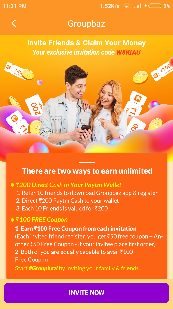 Groupbaz – Now Invite and Earn with. Social Shopping! Shop with friends and earn with India’s hottest social shopping platform everyday. Share with friends and earn 10₹ per refferal. And 50-50 free Coupon for shopping. Refer money reedem as PayTM cash. You can earn maximum ₹200 PayTM cash . New PayTM Loot app