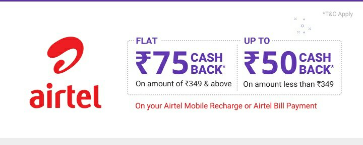 Get 75 rupee Cashback on Airtel Mobile recharge or bill paytment on amount 349 rupees and above. And get 50 rupee Cashback on amount less then 349 rupees
