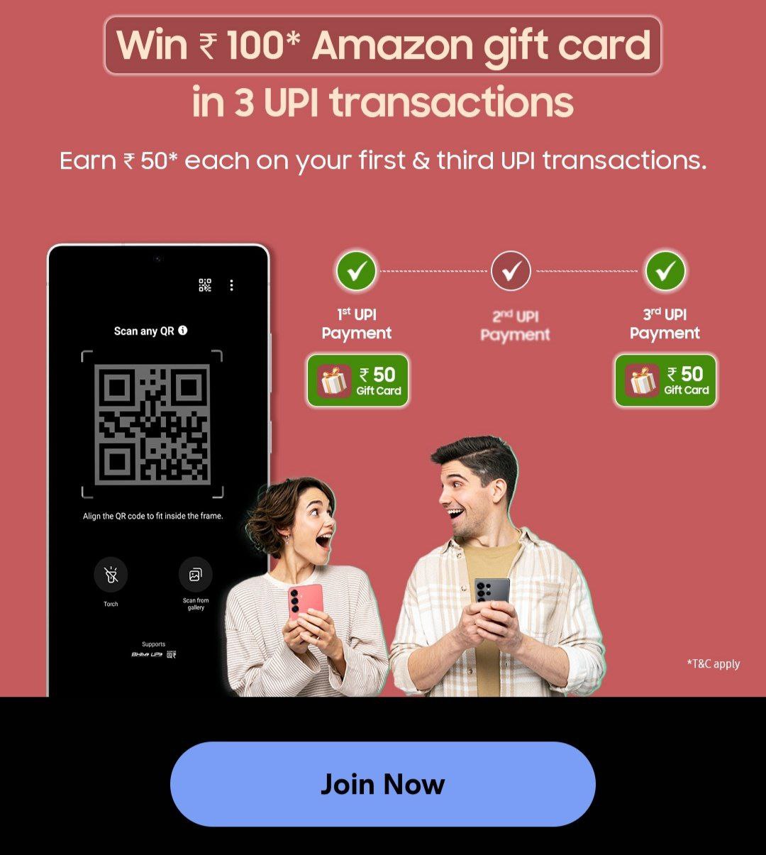 ✔ Reward: ₹100 gift card on 1st & 3rd UPI transactions