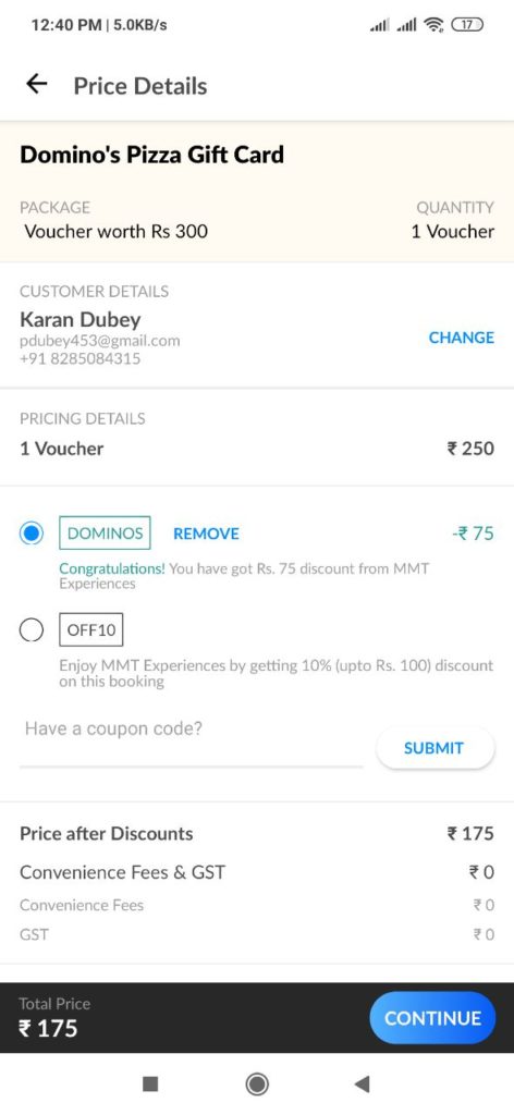 - Go for payment select the DOMINOS coupon then the amount will be 175